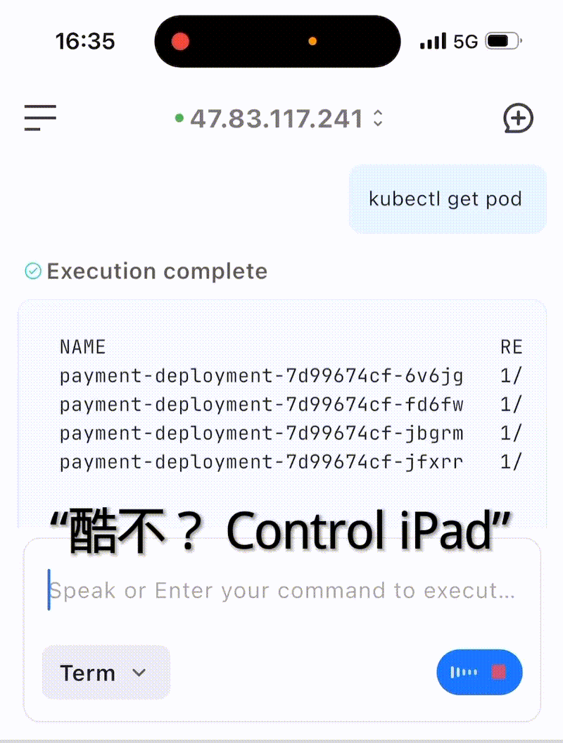 在 Terminal 模式下,你可以通过语音命令输入和 Snippets(快捷命令),快速输入指令。 而在对话模式下,则可以用自然语言的方式直接下达指令:“帮我把 payment 扩容到 10 个副本!” ,实现移动环境下的故障应急响应。