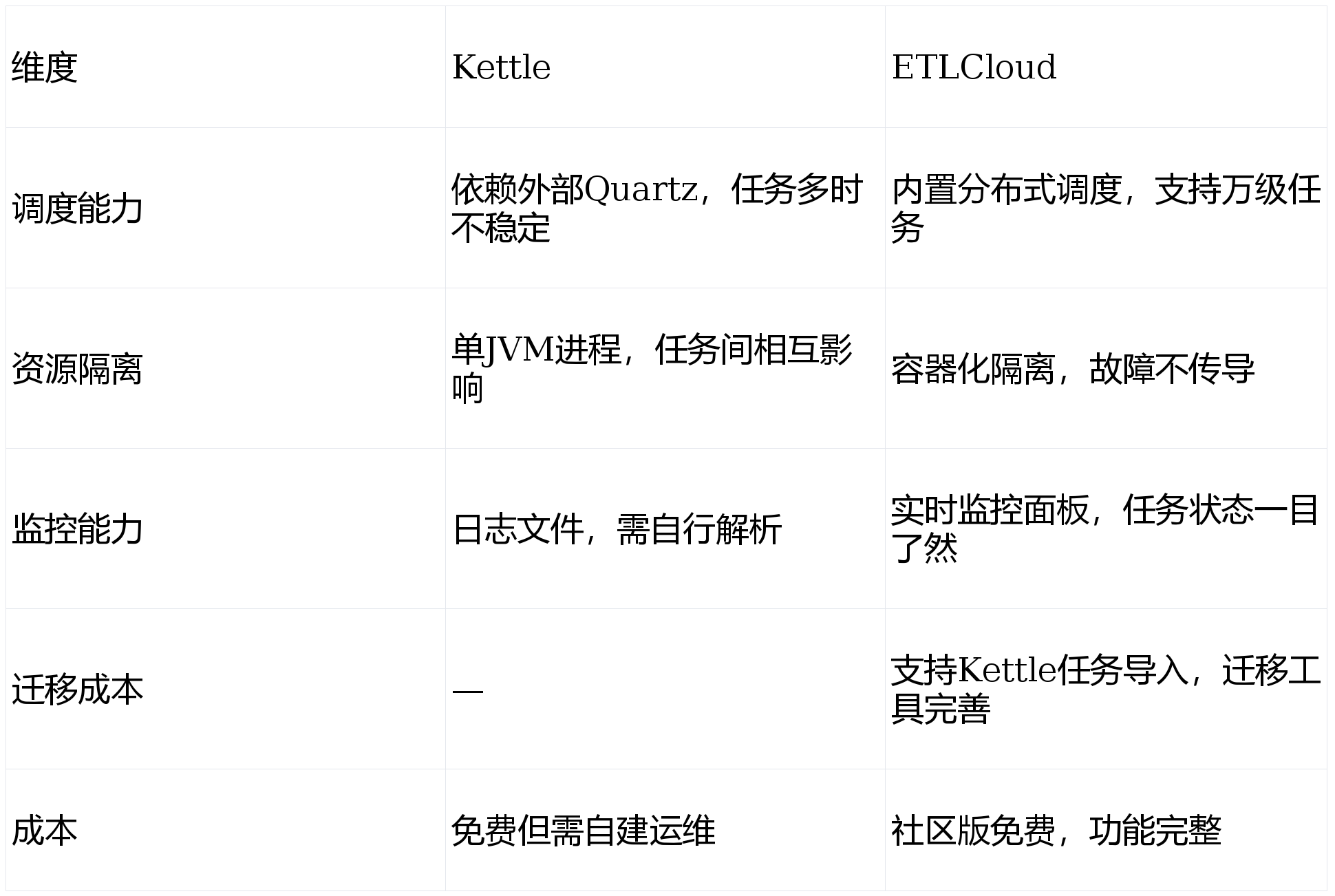 核心问题:Kettle的设计理念还停留在十年前——单机优先、资源不隔离、缺乏现代调度架构。在数据量激增、业务实时性要求提高的今天,它的瓶颈是结构性的,不是修修补补能解决的。