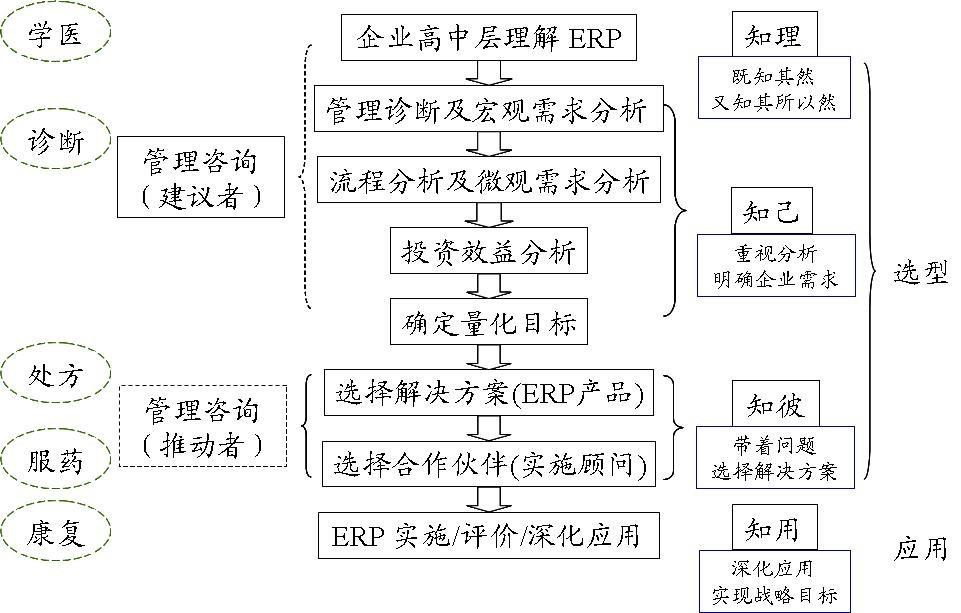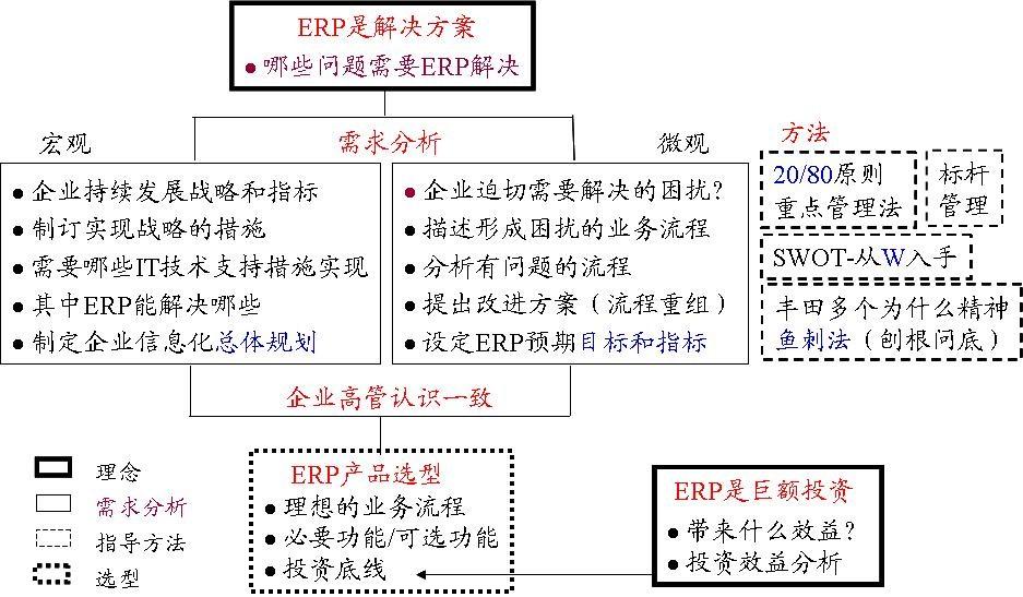强调需求分析前必须做管理诊断和因果分析,是因为各种管理问题并不一定都能通过实施ERP解决。以为“上了ERP就什么问题都解决了”是一种极大的误解,ERP并不是万能的。比如,产品成本高、质量差是由于加工工艺落后造成的,那么就需要更新设备、进行技术改造,而不是上ERP;如果企业问题是缺乏稳定市场,也不是上ERP就能完全解决的。换言之,改进管理就像看病,必须找准“病因”对症下药,治本才能治标。