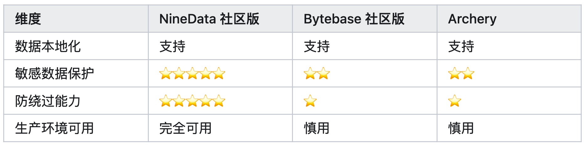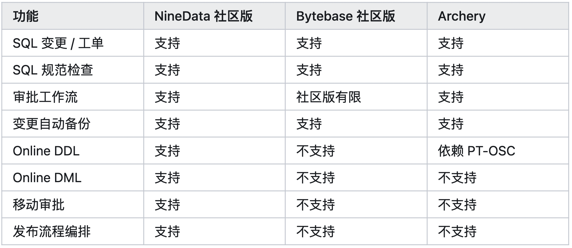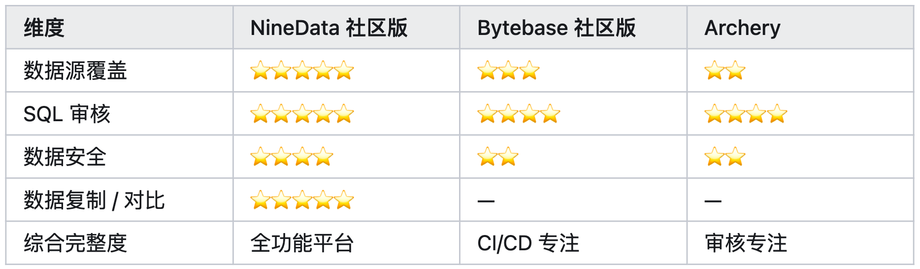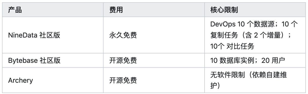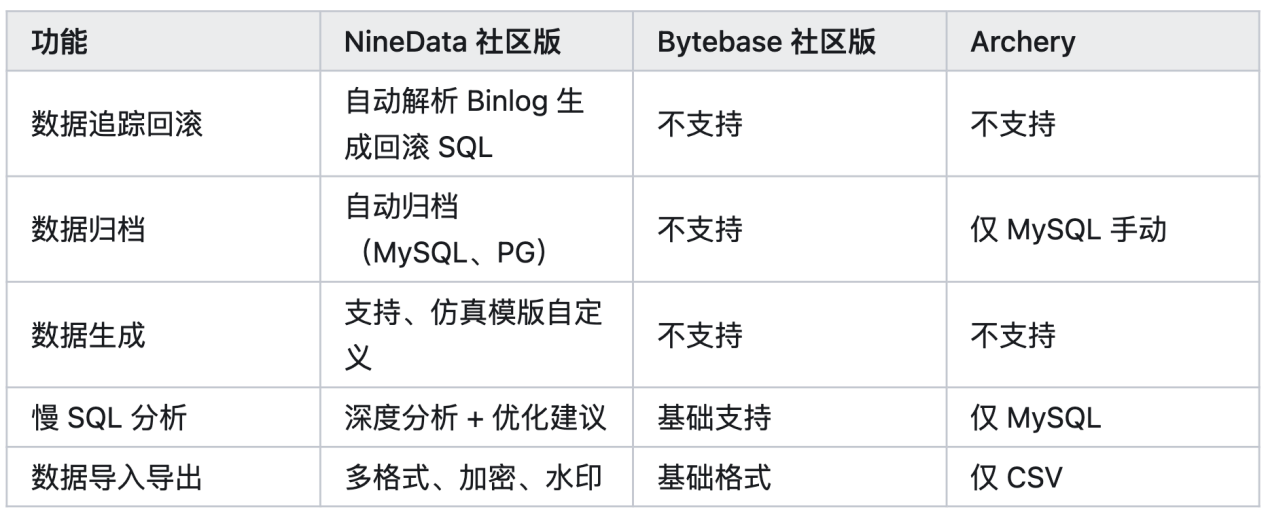今天,我们用一篇客观、严谨的横评,带你深度对比NineData 社区版 (v4.9.0)、Bytebase 社区版、Archery (开源) 三款主流工具。所有结论均可在官方文档中溯源,力求给你最真实的参考。