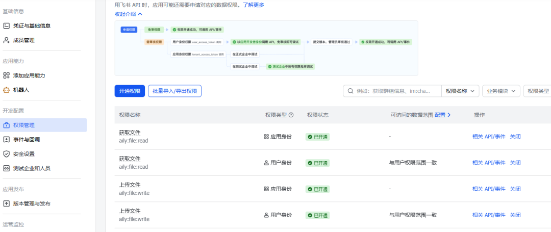 完成配置后,回到飞书开放平台。点击权限管理,开启对应的权限。