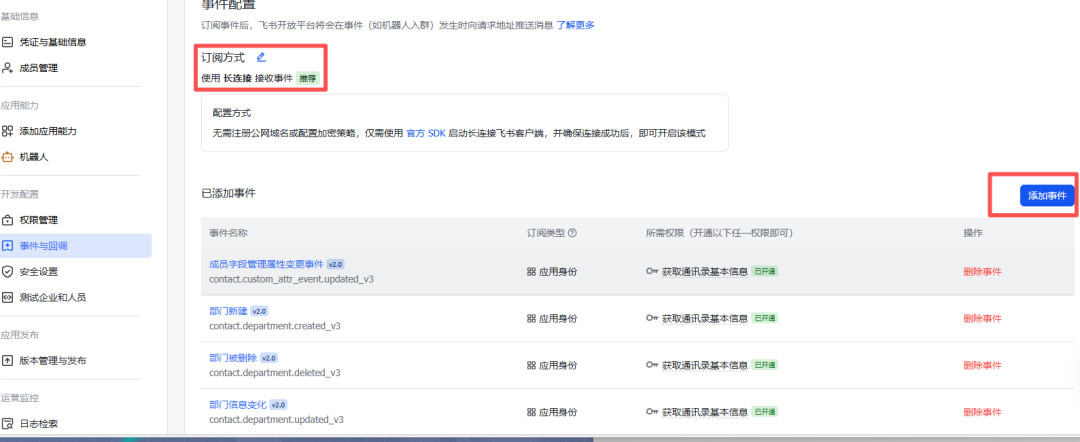 然后,点击事件与回调。配置订阅方式为长链接。并添加对应的事件。