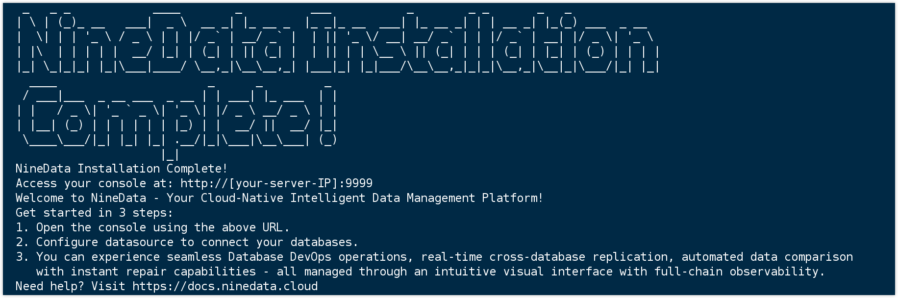docker run -p 9999:9999 --privileged -v /opt/ninedata:/u01 --name ninedata -d swr.cn-east-3.myhuaweicloud.com/ninedata/ninedata:latest