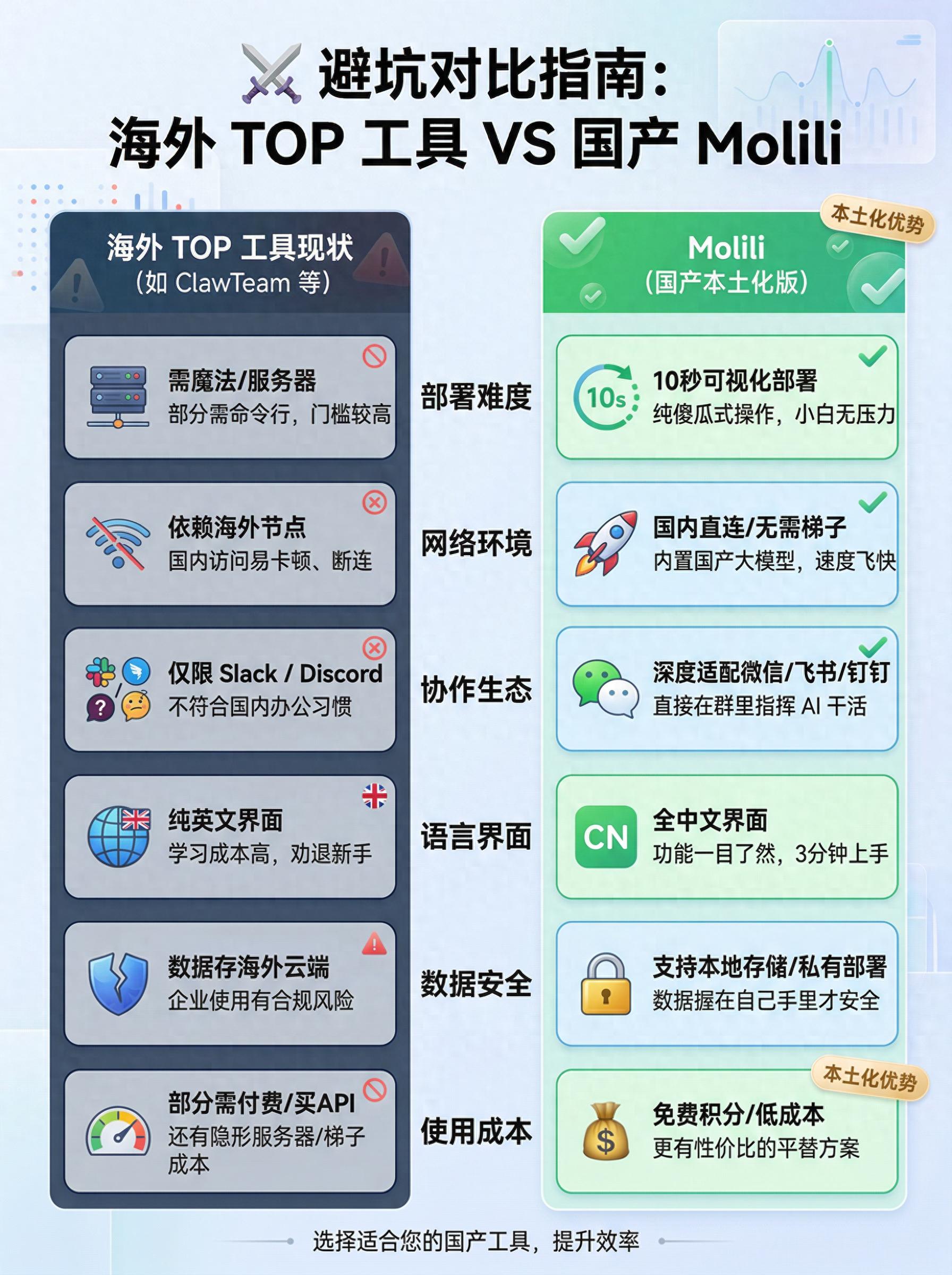 ClawTeam | AI Agent Teams(协同工具) | 1. 预制专家级 Agent 配置方案,开箱即用;2. 深度适配 OpenClaw,优化性能;3. 操作无门槛,非技术用户可快速上手;4. 覆盖企业 / 科研 / 开发多场景 | 团队协作,需专用 Agent 配置 | 5.0 |