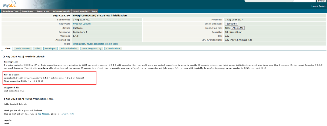 通过MySQL官方Bug库(https://bugs.mysql.com/bug.php?id=115736)可明确验证,mysql-connector-j8.4.0版本存在官方确认的驱动侧Bug