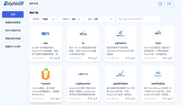 在最新发布的 DolphinDB 3.00.5 & 2.00.18 版本中,Marketplace 迎来了重磅升级——模块(Module)板块正式上线!从数据迁移、因子开发到绩效归因,全方位提升用户的业务增效能力。