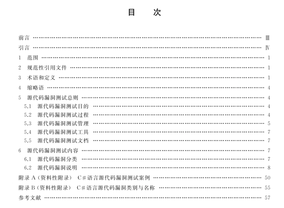 GB/T 34946-2017《C#语言源代码漏洞测试规范》将源代码测试过程分为测试策划、测试设计,测试执行和测试总结四个阶段。