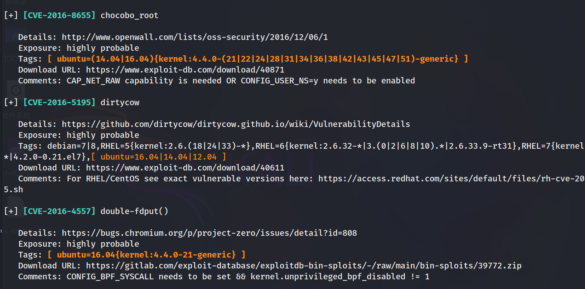 工具推荐了多个可用的内核提权漏洞,选择使用 CVE-2016-4557(eBPF 双重释放漏洞),(比脏牛更稳定。因为脏牛的一个exp失败了,就中间这个,靶机崩了,下面的就是脏牛的,先编译,后续不写了,靶机崩了3次)