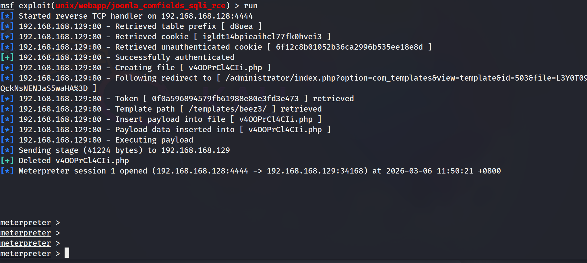 登录成功后,回到 MSF 重新执行攻击,这次成功获取 shell: