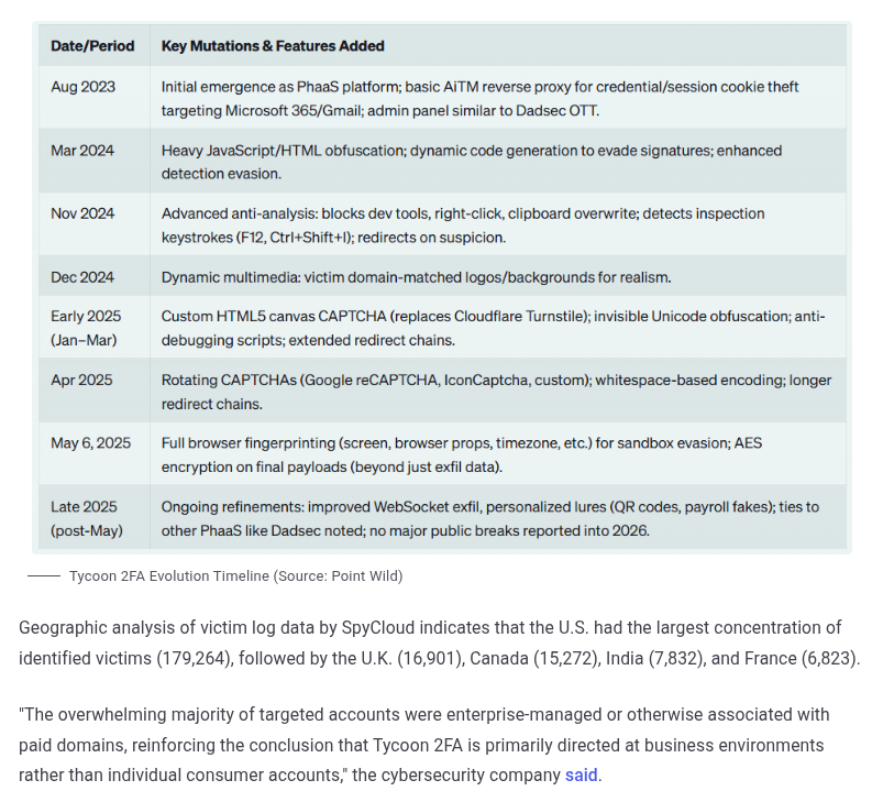 Intel 471的报告指出,Tycoon 2FA直接关联了超过64,000起已确认的钓鱼事件。Proofpoint在2026年2月的单独观测中就发现了超过300万条与该工具包相关的消息。这些数据表明,Tycoon 2FA不仅是一个偶发的威胁,而是一个持续、高频且大规模的自动化攻击源。