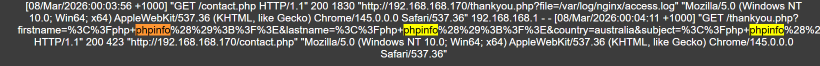 <?php phpinfo();?>然后再通过文件包含访问 /var/log/nginx/access.log,可以看到成功执行了: