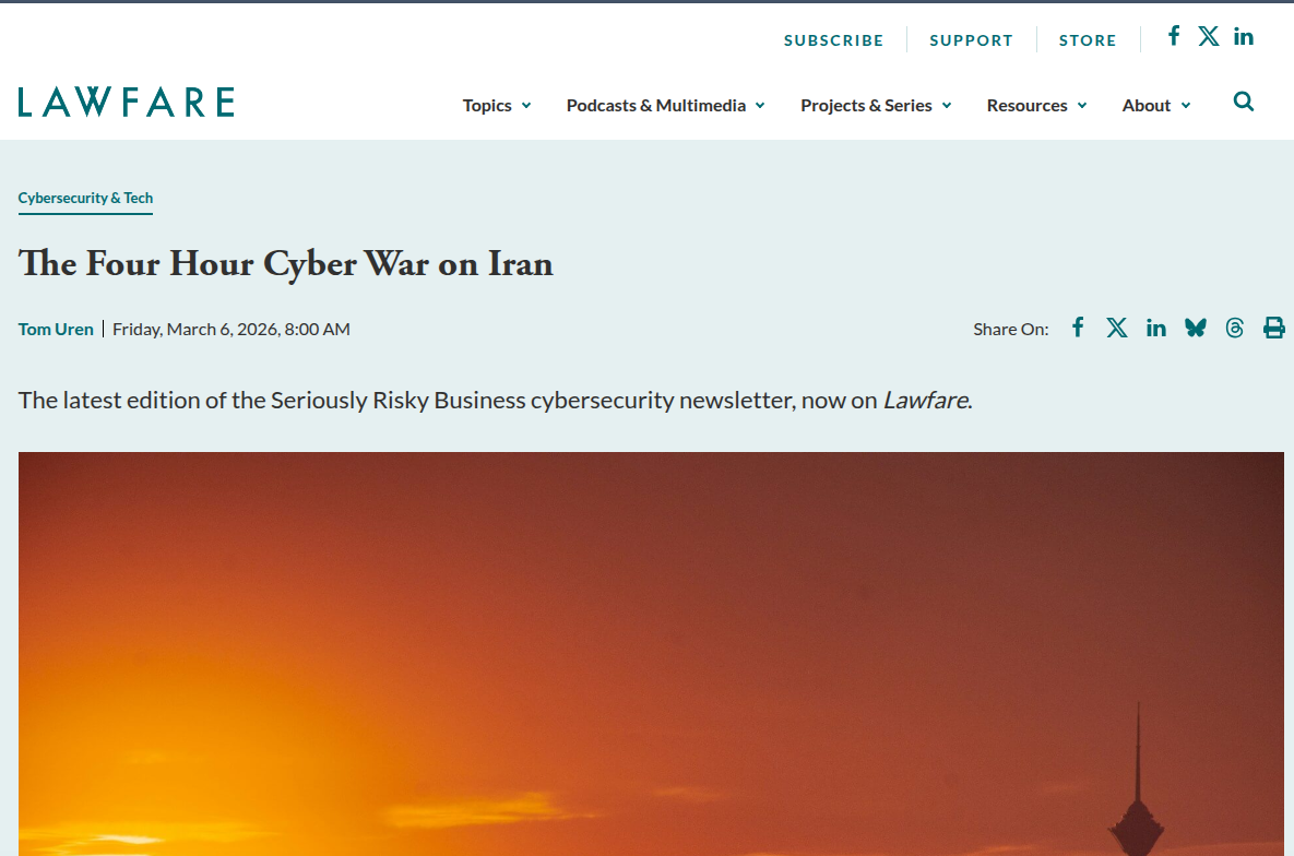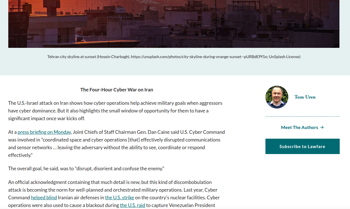 网络空间作战(Cyber Operations)在现代混合战争中的地位日益凸显,已从辅助性支援手段演变为决定战役初期成败的关键变量。2026年3月6日,Lawfare媒体刊文《伊朗的四小时网络战》,详细披露了美国与以色列在针对伊朗最高领导人阿里·哈梅内伊的斩首行动及对核设施的打击中,如何协同运用网络能力达成战术突然性。美军参谋长联席会议主席丹·凯恩将军在随后的简报中确认,美国网络司令部(U.S. Cyber Command)执行了协调一致的太空与网络行动,有效破坏了伊朗的通信与传感器网络,致使 adversary(敌方)丧失了态势感知、协调及有效反击的能力。
