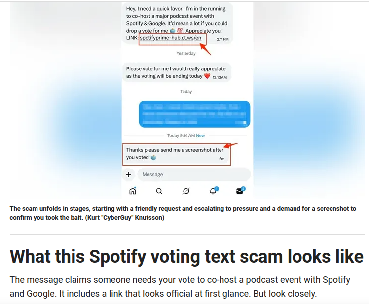 该骗局的典型特征在于其精心设计的“剧本”。攻击者首先通过入侵或伪造一个熟人的社交账号,向受害者发送一条看似无害且充满人情味的求助信息:“嘿,我需要帮个小忙,我正在竞选Spotify和Google联合举办的重大播客活动的联合主持人,如果能投我一票就太好了。”这种基于“互惠原则”与“社会认同”的心理操纵,极大地降低了受害者的防备心理。随后,攻击者通过制造“投票今日截止”的紧迫感,迫使受害者在未加仔细甄别的情况下点击恶意链接。