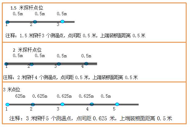 探杆数字测温仪是专为临时储粮仓、土壤、酒窖的温度检测配套生产的,每根探杆根据装粮高度的不同设计 2-5 个测温点,每检测一次,每层的温度便自下而上自动巡检 3 次,仪表面板上的点位号和温度值一一对应,方便管理者查看和记录。