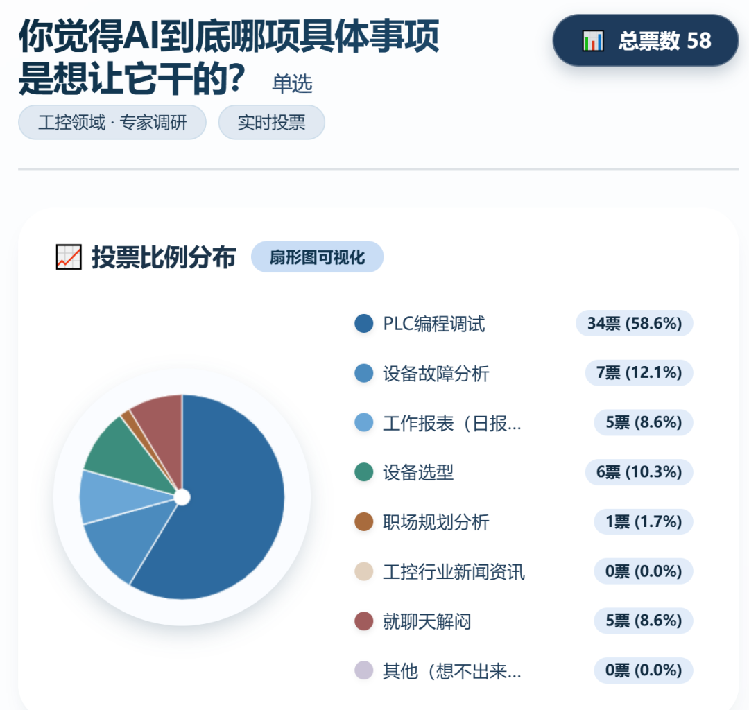 毫无疑问,对于电气工程师来说,最想AI帮咱做的事情就是PLC编程,我们之前的投票:
