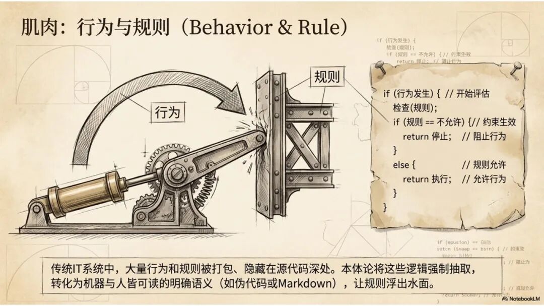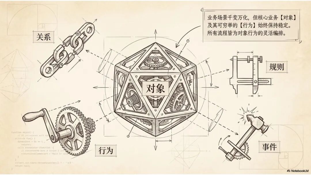 所以说来说去,就更容易理解为什么一直在强调本体模型的核心就是"对象-关系-行为-规则"。对象里面包含了关系,行为里面包含了事件。对象、关系、行为、规则、事件,这些天然形成了一个完整的整体,形成了一个相互影响、相互约束的很大的语义网络,这才是本体模型带来的最大价值。