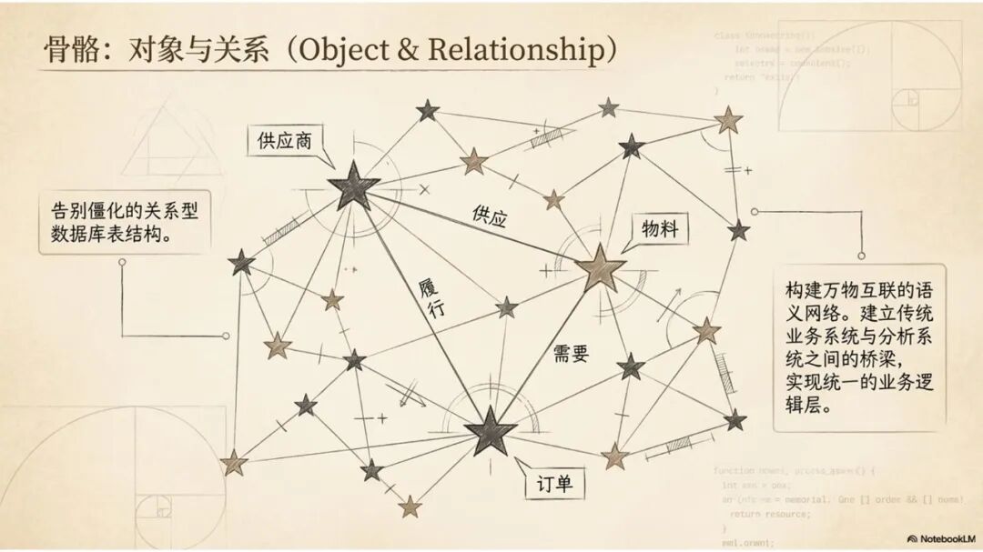 这个时候对于业务主管来说就很轻松了,只需要在业务系统里面最终审核一下本体模型或AI给出的最终决策建议:究竟是选择推迟客户交期,还是引入一个新的供应链合作伙伴?审核通过以后自动生效。通过这种模式,数据分析决策这一块跟业务运作系统实现了完整的双向协同和连接。这个双向协同连接的完成,需要底层有一个核心的本体模型来支撑。