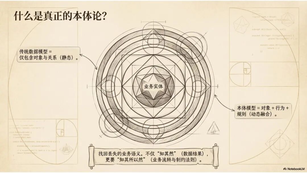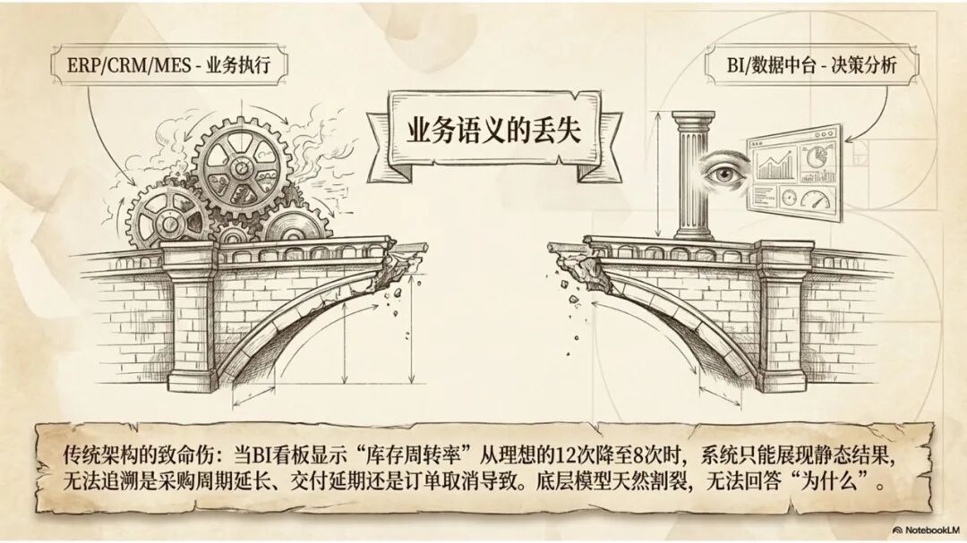 因为在分析决策类系统建设过程中,依托的是底层标准数据模型,同时基于数仓建模思路进行分层建设。但在分析决策类系统构建过程中,数据模型天然丢失了业务语义。也就是说,虽然拿到了数据模型,但它是偏静态的数据模型,只有数据对象、属性和对象之间的关系,不会告诉你数据本身形成的来龙去脉,也不会告诉你数据的关键属性状态变化需要触发什么样的业务行为,这些全部丢失掉了。