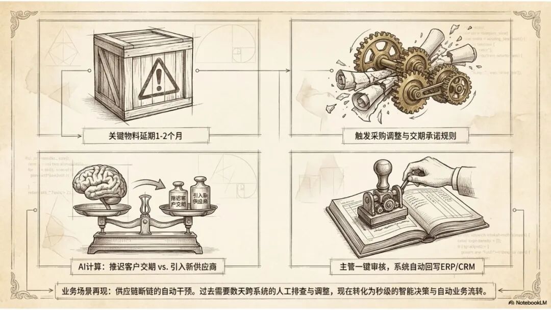 同时,本体模型下面本身就有一个供应链计划优化调度的模型,这个模型融合了我刚才说的供应商、物料、合同、订单、交期、约束规则等各种东西,天然地重合成一个大模型。这个大模型拿到关键物料交期延误的消息以后,会自动计算,给出一个最优决策。这个最优决策有可能是把某一个客户订单朝后面延,也有可能是引入新的关键合作伙伴供应商。然后它把这个决策调用供应链系统或CRM系统提供的回写API接口,把这些相关决策回写到业务系统里面去。