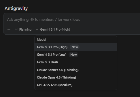 在Google最开始发布Antigravity的时候,就了解到个人可以体验到免费的Gemini和Claude顶级大模型。目前主要的模型已经支持: