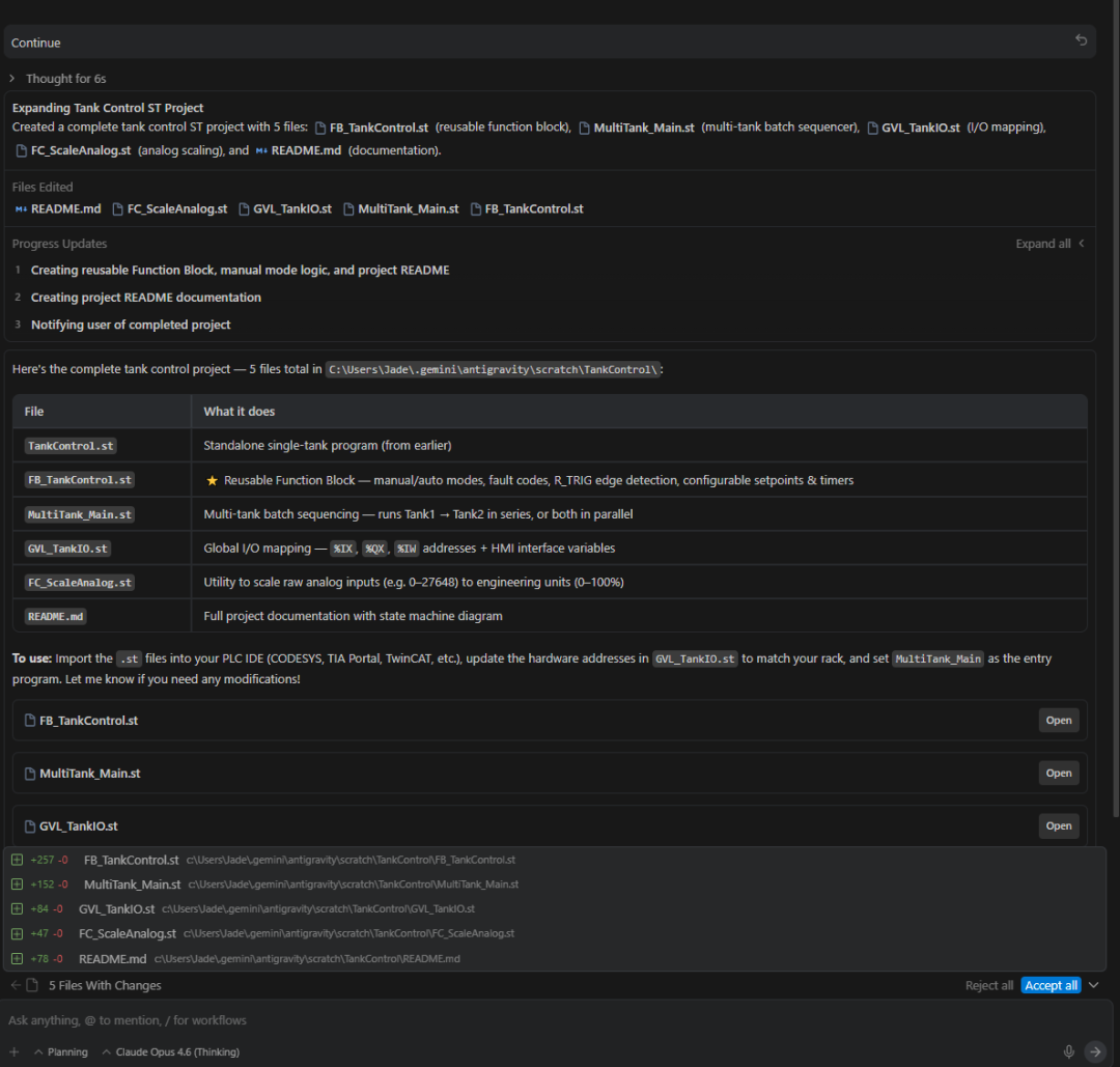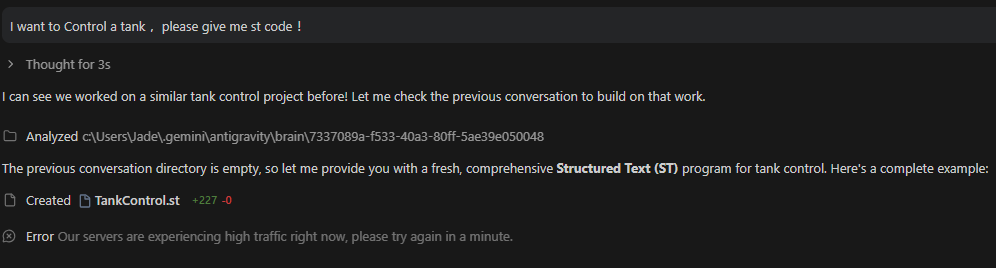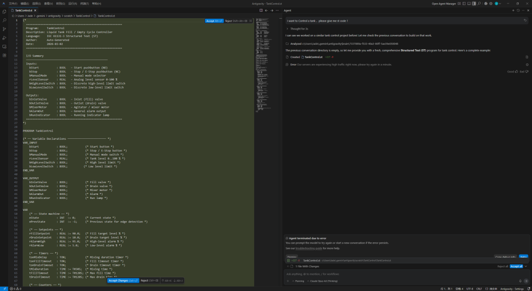 I want to Control a tank ,please give me st code !它会思考一会,然后左侧打开后缀为.st的代码文档,具体代码我放下方: