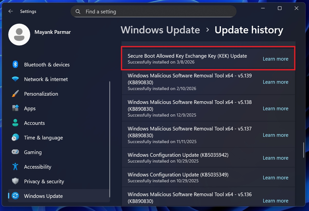 如果你最近打开Windows更新检查更新,可能会发现一个待处理的更新——“Secure Boot Allowed Key Exchange Key (KEK) Update”(安全启动允许的密钥交换密钥更新)。这个更新需要重启系统才能完成安装。如果你暂时没看到这个更新,要么是已经安装过了,要么是很快就会推送。无论如何,这个更新最终都会来到你的电脑上,而且你确实需要它。