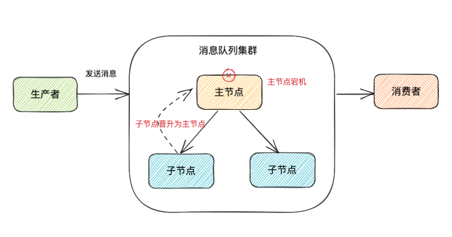 在消息队列是集群的情况下,有可能遇到当生产者发送消息给消息队列时,主节点接收到了生产者发送到消息,并且成功将消息写入到磁盘中,但是消息还没来得及同步到子节点,此时主节点发生宕机,子节点被晋升为主节点,遇到这种情况,消息也会发生丢失;