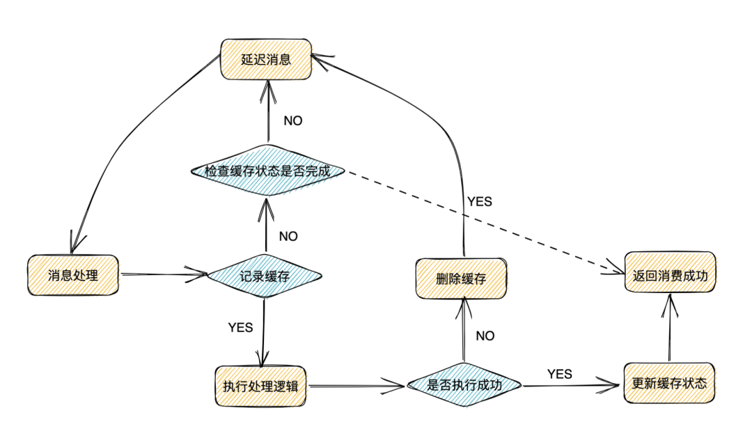 当消费者开始进行消息处理的时候,先往 redis 组件中记录一条带处理状态的缓存记录,再进行业务逻辑处理,如果此时处理逻辑执行成功,没有异常,则更新缓存中的处理状态并返回 ack 处理成功;