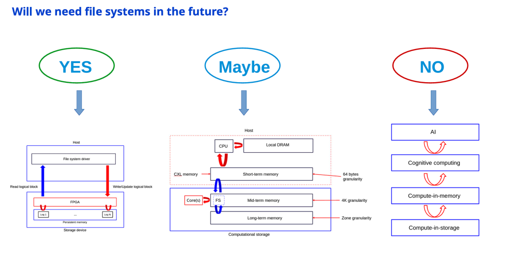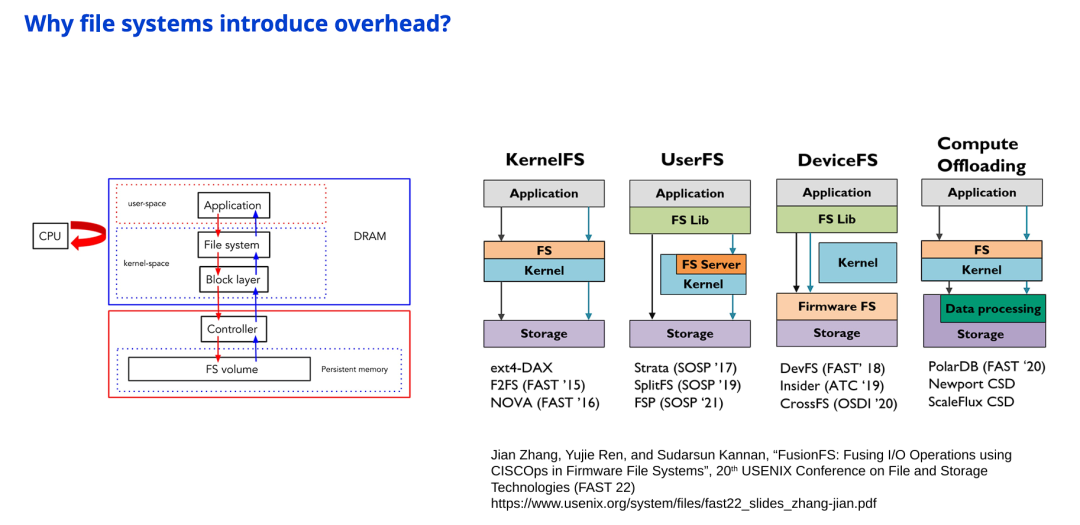 图片探讨了文件系统在新型硬件(CXL, FPGA) 和新型负载(AI) 冲击下的生存状态: