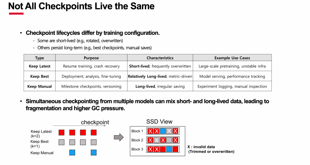 PPT的核心观点是,检查点并非单一类型的数据,其多样化的生命周期是导致SSD在AI训练场景下性能问题的根本原因。