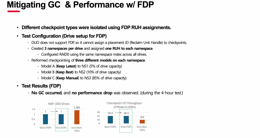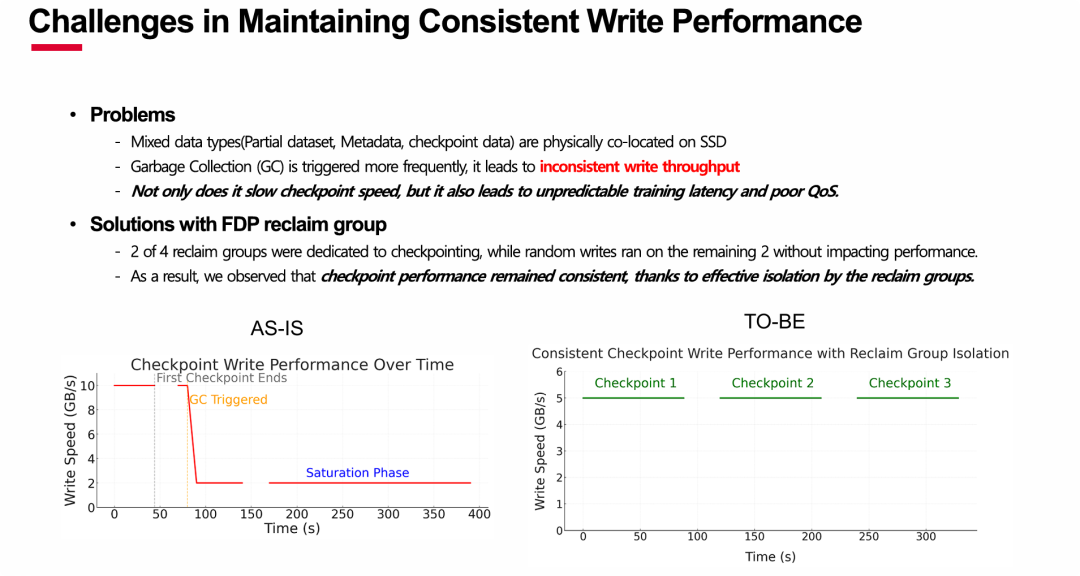 效果验证: “AS-IS”与“TO-BE”的对比图鲜明地展示了该方案的有效性。在没有隔离的情况下,写入性能会从峰值(10 GB/s)暴跌至谷底(2 GB/s);而在采用FDP隔离后,虽然峰值性能可能有所降低(稳定在5 GB/s),但获得了完全一致且可预测的性能 ,这对于保障整体训练时长和系统QoS至关重要。