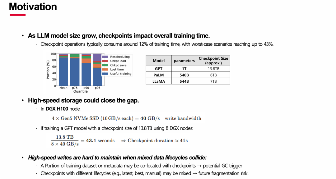 表面的解决方案: 其次,指出利用现代高速硬件(如Gen5 NVMe SSD)强大的原始带宽,理论上可以将检查点保存时间缩短到分钟以内,看似问题已经解决。