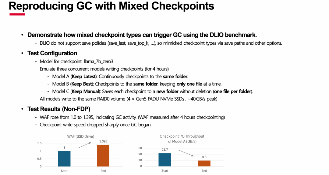 图表: 右侧的柱状图展示了模型A(Keep Latest)的检查点I/O吞吐量变化。在测试开始时,吞吐量为21.7 GB/s,接近硬件的理论性能。而在测试结束时,吞吐量骤降至9.6 GB/s,性能下降了超过55% 。