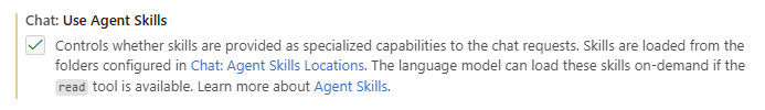 打开 VS Code,进入 GitHub Copilot 插件设置,找到“Chat: Use Agent Skills”配置项并启用。
