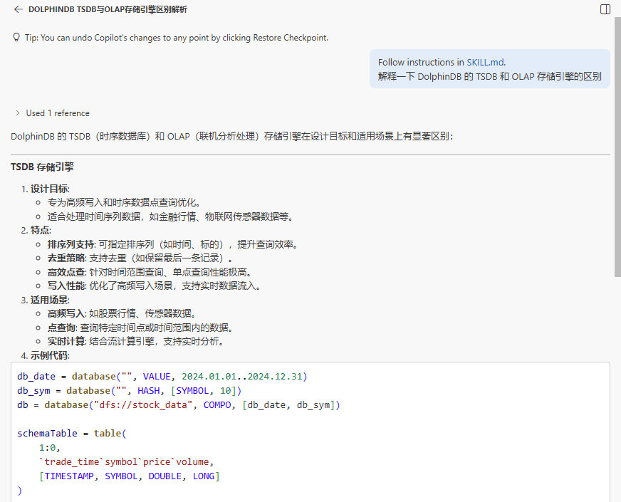 DolphinDB Skill 会结合官方文档内容,用通俗语言拆解知识点+搭配示例,边开发边学习,无需额外查文档。