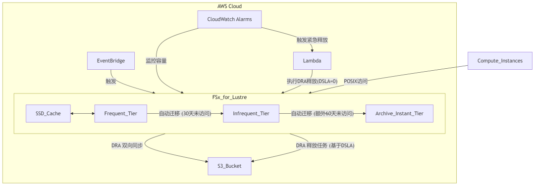 FSx for Lustre 智能分层通过其内部多级自动分层以及与 S3 的 DRA 集成,提供了从亚毫秒级高性能访问到极低成本长期归档的完整数据管理光谱。这种多层次的“冷数据”处理能力,使得用户可以根据数据的实际访问需求和生命周期,实现非常精细化的成本与性能平衡。