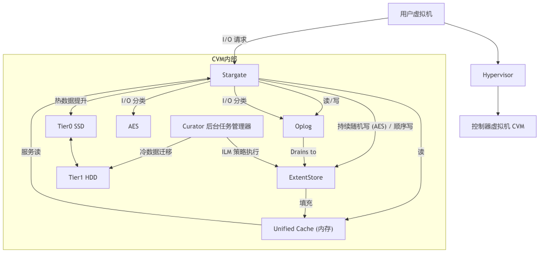 Nutanix AOS 智能分层架构图 Nutanix AOS 的智能数据分层不仅是简单的热冷数据迁移,其对 I/O 类型的细致分类(突发随机、顺序、持续随机)和针对性的处理路径(Oplog、AES、直接写入 Extent Store)表明了一种在数据生命周期早期就进行智能化处理的设计哲学。这种主动的性能优化与后续基于访问历史的被动分层相结合,共同构成了 AOS 高效数据管理的基础。