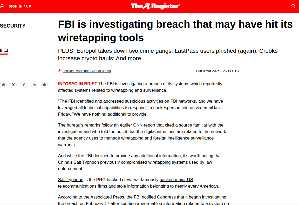 在数字治理与国家安全日益交织的当下,执法机构的监控基础设施已成为网络对抗的前沿阵地。这些系统不仅承载着打击犯罪的核心职能,更汇聚了海量的敏感公民数据与国家安全情报。一旦此类系统失守,其后果远超普通商业数据泄露,将直接动摇公众对法治体系的信任根基,并可能危及正在进行的秘密调查行动。2026 年 3 月,FBI 证实对其网络系统中存在的“可疑活动”进行调查,且后续披露显示,受影响的系统直接关联到监听(wiretapping)与外国情报监视 warrant 的管理流程。这一事件并非孤立存在,而是全球范围内针对关键基础设施与执法机构网络攻击浪潮中的最新一环。