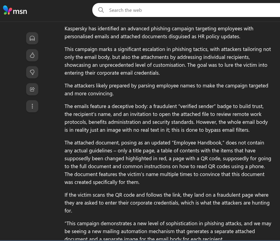 本文将以尼日利亚发生的这一系列攻击事件为蓝本,结合网络安全领域的最新研究成果,系统性还原攻击全过程。文章将重点分析攻击者如何利用伪造的HR通知构建信任陷阱,如何通过动态反向代理技术实时拦截并绕过MFA,以及如何利用窃取的凭据进行横向移动。同时,本文将探讨现有防御措施的不足,并提出基于零信任理念的改进方案,包括实施基于风险的自适应认证、部署反钓鱼API集成以及建立全员参与的威胁情报共享机制。通过理论分析与技术实证相结合,本文旨在为企业提供一套可落地的综合防御策略,以遏制此类针对核心业务流程的攻击态势。
