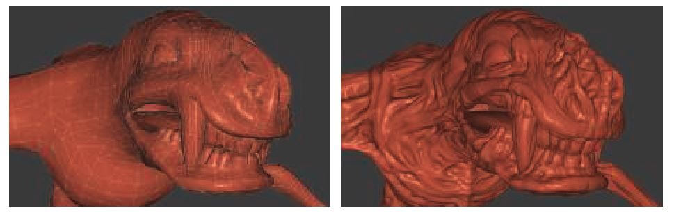 图3.11. 左边是大约 6000个三角形的底层网格。在右侧,每个三角形都使用PN三角形细分进行细分和置换。(来自NVIDIA SDK 11[1301]样本的图像,由NVIDIA Corporation提供,模型来自4A Games工作室的游戏《地铁2033》。)