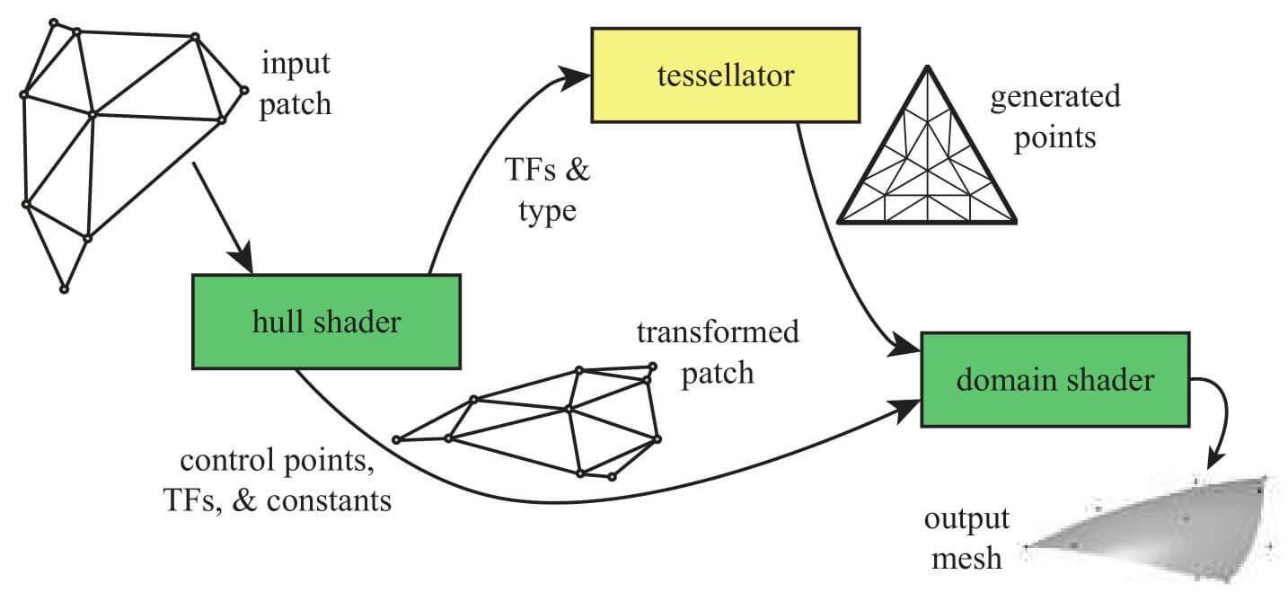 曲面细分阶段总是由三个元素组成。使用DirectX的术语,它们是外壳着色器、曲面细分器和域着色器。在OpenGL中,外壳着色器是曲面细分控制着色器,域着色器是曲面细分评估着色器,它们虽然冗长,但更具描述性。固定功能曲面细分器在OpenGL中称为图元生成器,正如将要看到的确实做法。