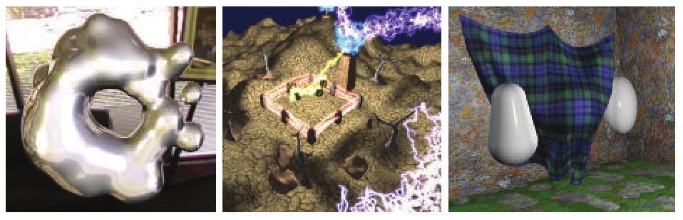 图3.13. 几何着色器(GS)的一些用途。在左侧,使用GS即时执行元球等值面细分。在中间,使用GS完成线段的分形细分并输出,并且由GS生成广告牌以显示闪电。在右侧,布料模拟是通过使用带有流输出的顶点和几何着色器来执行的。(来自 NVIDIA SDK 10 [1300]示例的图像,由NVIDIA Corporation提供。)