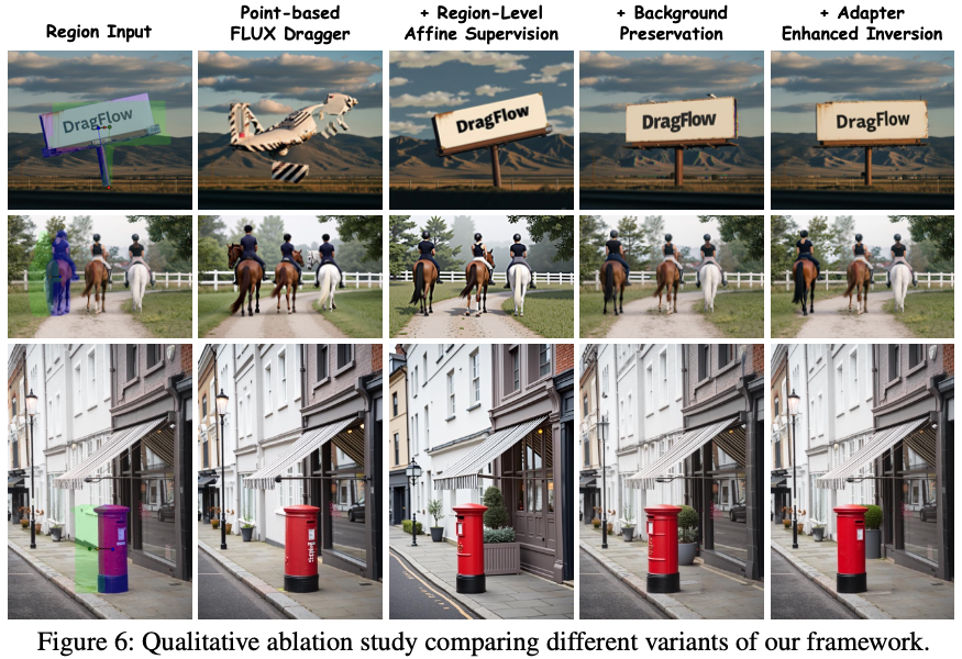 我们通过逐一添加 DragFlow 的核心组件来验证其有效性。结果(见 Table 3 和 Figure 6)清晰地表明: