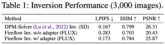 传统的键值注入(KV injection)在 FLUX 这类 CFG-distilled 模型上效果不佳。我们发现,FLUX 的反演漂移问题比 SD 更严重(见下表)。