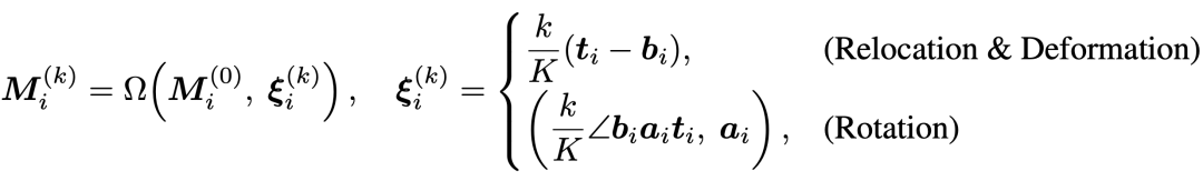 目标掩码 由源掩码 经过一个逐步变化的仿射变换 得到。变换参数 根据编辑类型(平移、形变或旋转)和迭代步数 线性插值生成。