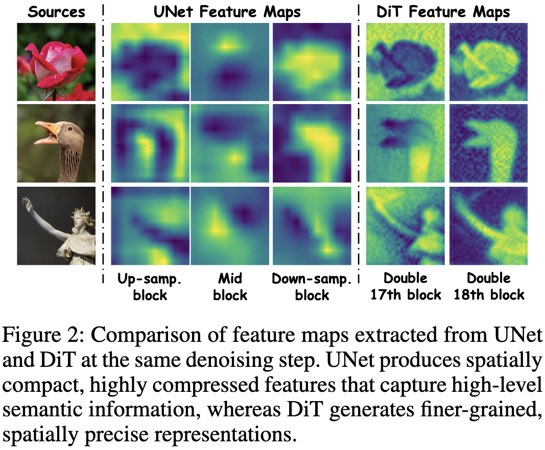 研究结果认为问题的根源在于 UNet 与 DiT 网络层的特征图粒度存在本质差异: