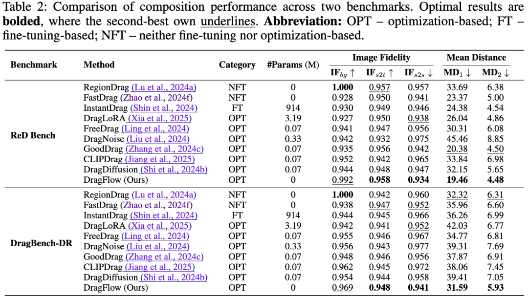 如 Table 2 所示,DragFlow 在基于两大基准的多个指标上取得了最佳表现: