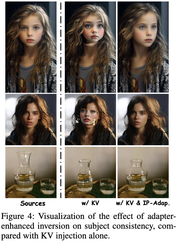 如下图所示,通过额外在反演和取样过程中加入 IP-Adapter Embedding 后,人物身份的保持效果远超单独使用 KV 注入。