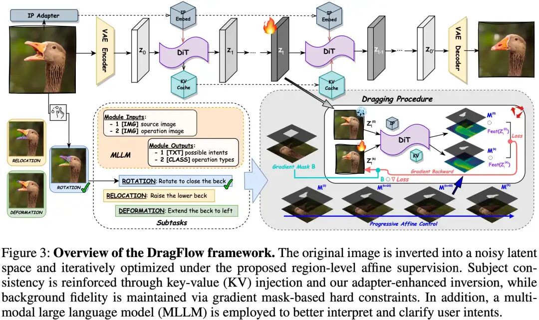 DragFlow 的完整框架如下图所示,它整合了 MLLM 辅助交互、IP-Adapter ID注入、Key & Value Caching,以及核心部分基于仿射的区域拖拽优化工作流。